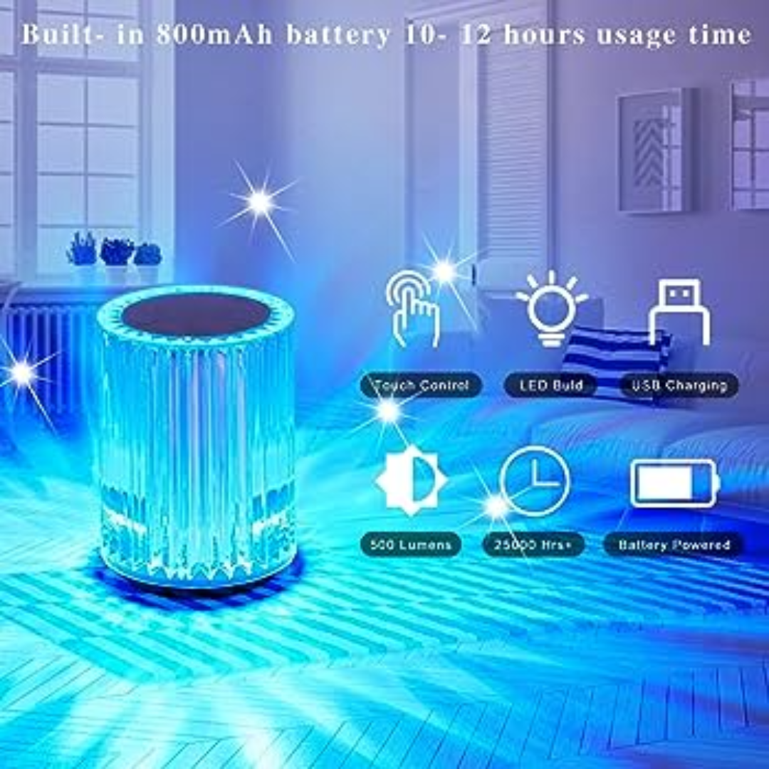 Crystal table lamp with USB: Built-in rechargeable lithium battery allows you to use it outdoors. The battery lasts 12 hours at minimum brightness when fully charged.