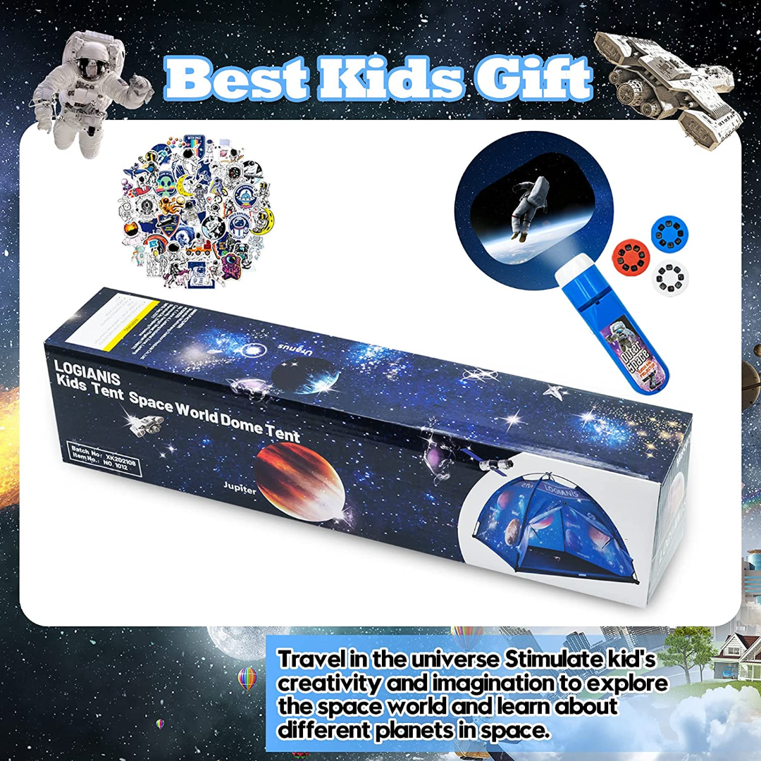 PERFECT INDOOR PLAYHOUSE:This kids tent measures is 48”L x 48”W x 42”H inches which is sufficient for 2-3 children to play.Our product includes a space HD projector and funny stickers, Kids can play as astronauts, space explorers or aliens, so as to make the fun play of traveling into space.