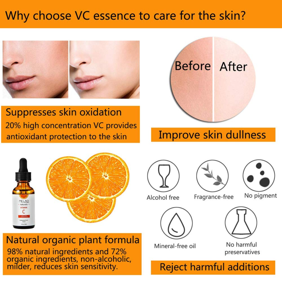 Melao Vitamin C serum has the Anti Aging power of Vitamin C + E + Amino + Hyaluronic Acid. It stimulates collagen production. It helps to make your skin more vibrant, firm, and youthful. It contains antioxidants properties. They help to reduce skin damage caused by the sun, pollution, and impurities in the air.
