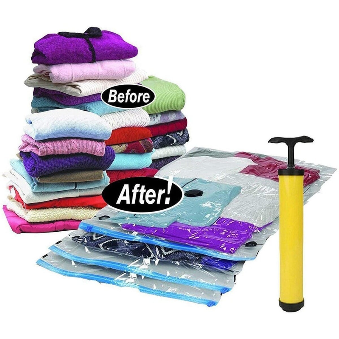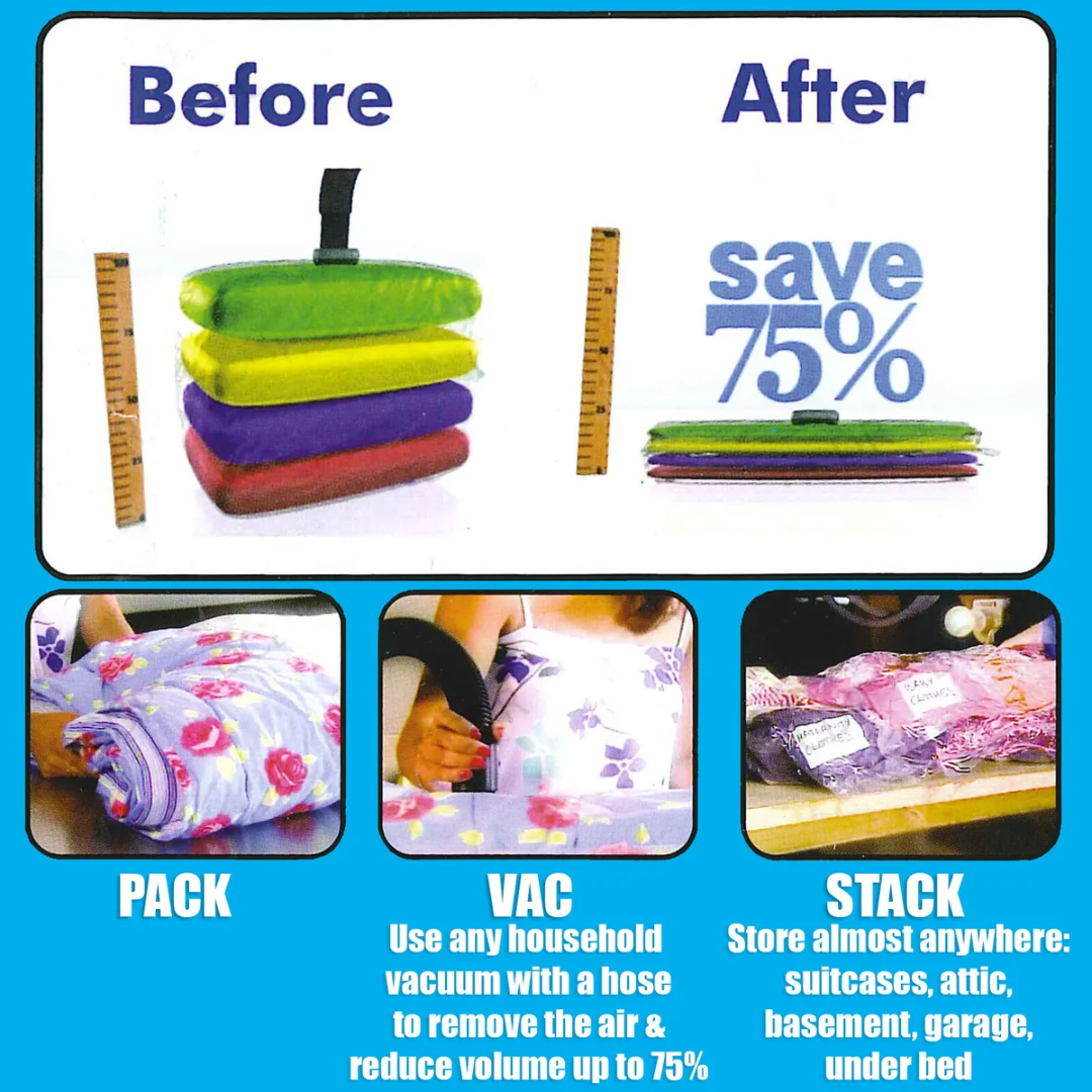 3X Storage Space: Taking every bit of air from the bags shrinks blankets and quilts to 80% and clothes and other goods to 60% paving space for more storage. As every season requires swapping clothes out of the wardrobe, vacuuming helps create 3X storage space in the wardrobe for various seasons.