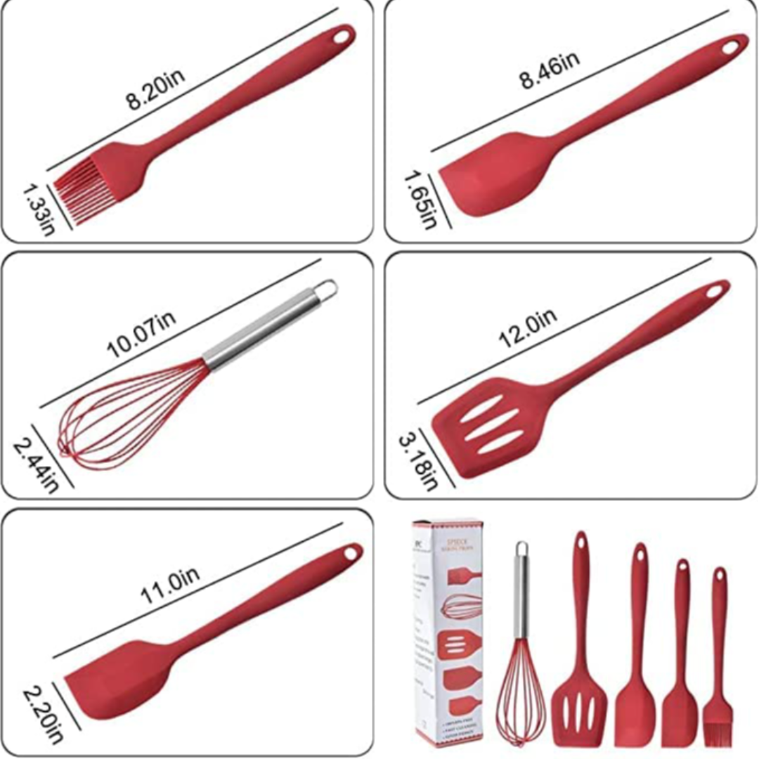 Meet all your needs: 5 different silicone cooking utensils, Turner, Large Spatula, Whisk, Small Spatula, Basting Brush. Meet multiple cooking demands. Best for cooking or bbq.