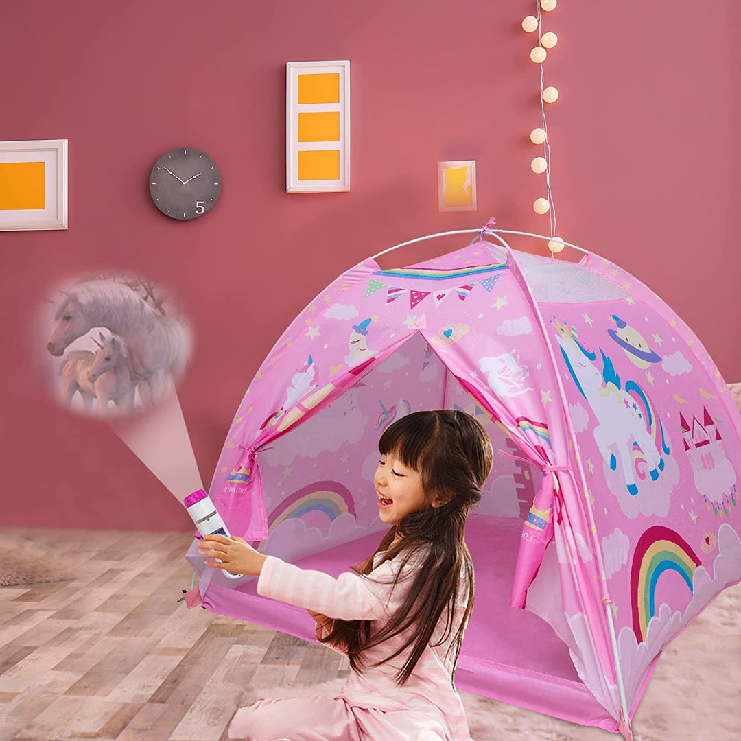 PERFECT INDOOR PLAYHOUSE:This kids tent measures is 48”L x 48”W x 42”H inches which is sufficient for 2-3 children to play.Our product includes a unicorn HD projector and funny stickers, Girls can play the role of princesses in the playhouse,And a private space specially created for girls.